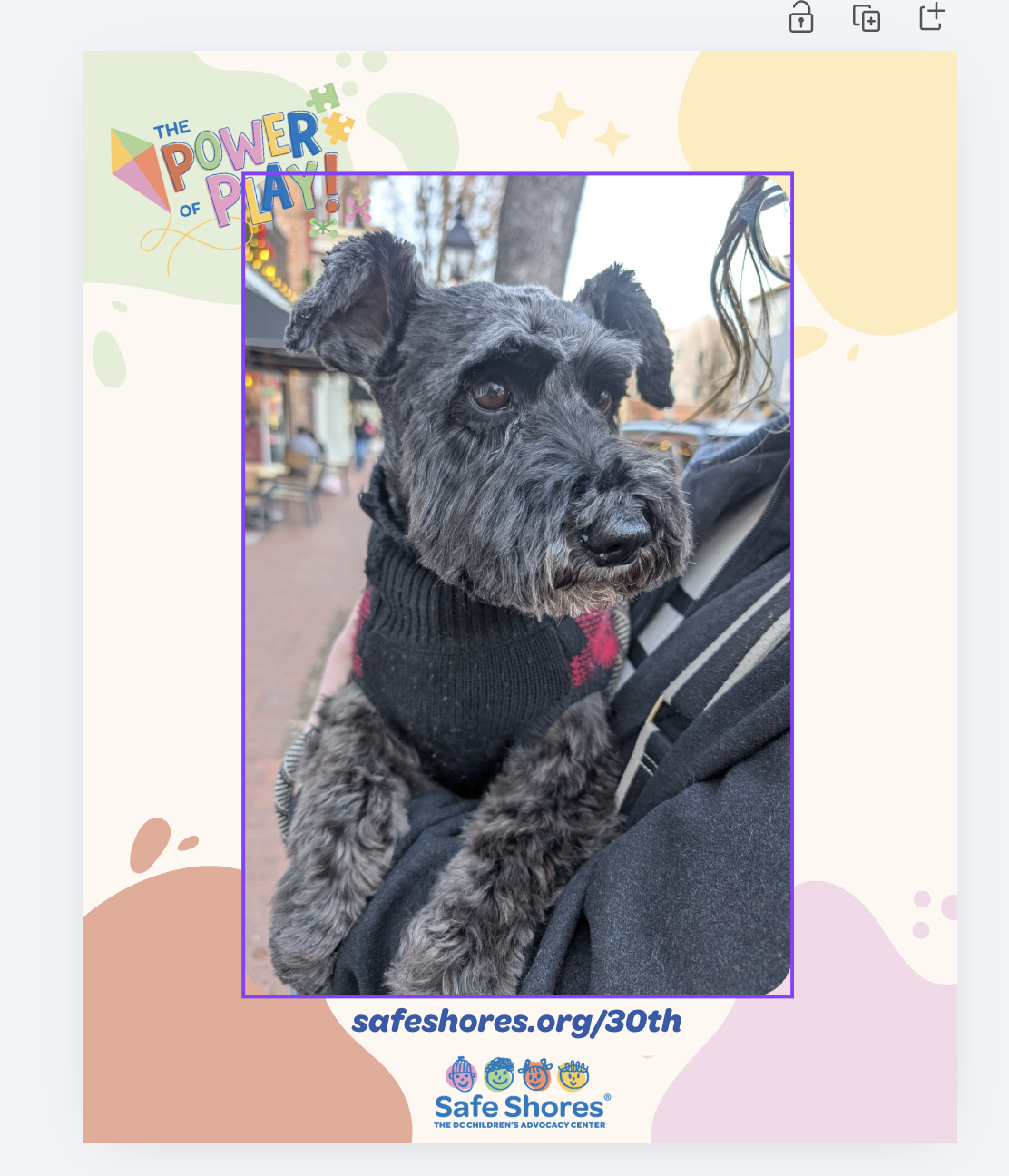 Use the Canva template above to upload a throwback (or recent) photo of your time serving on Safe Shores’ board.