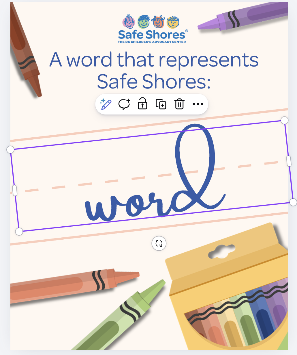 When I think of Safe Shores, the word [YOUR WORD] immediately comes to mind. One of the reasons I am so proud to serve on the board for Safe Shores is because their commitment to [YOUR WORD] in their day-to-day, life-saving work with children impacted by abuse in DC that they have been undertaking for 30 years.