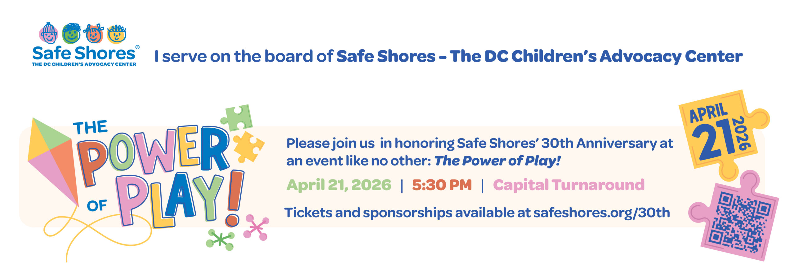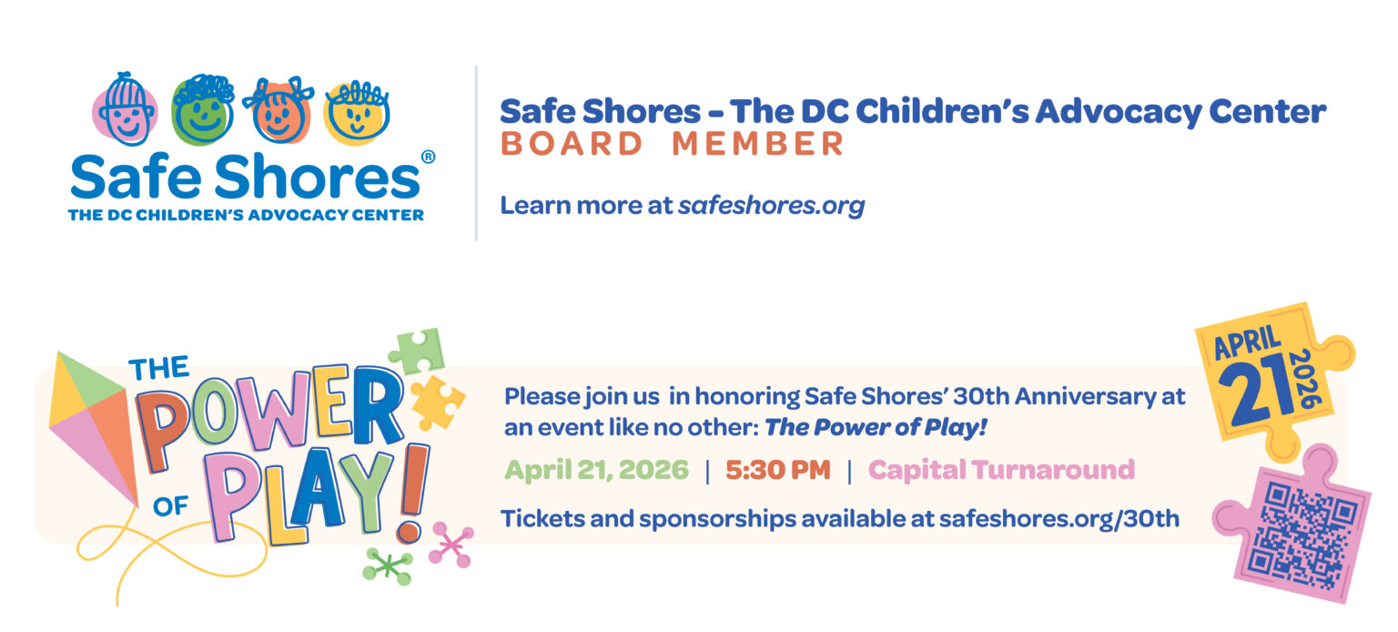Join me at The Power of Play! Safe Shores – The DC Children’s Advocacy Center’s 30th Anniversary Event on April 21, 2026. Learn more at safeshores.org/30th or ask me for more information!