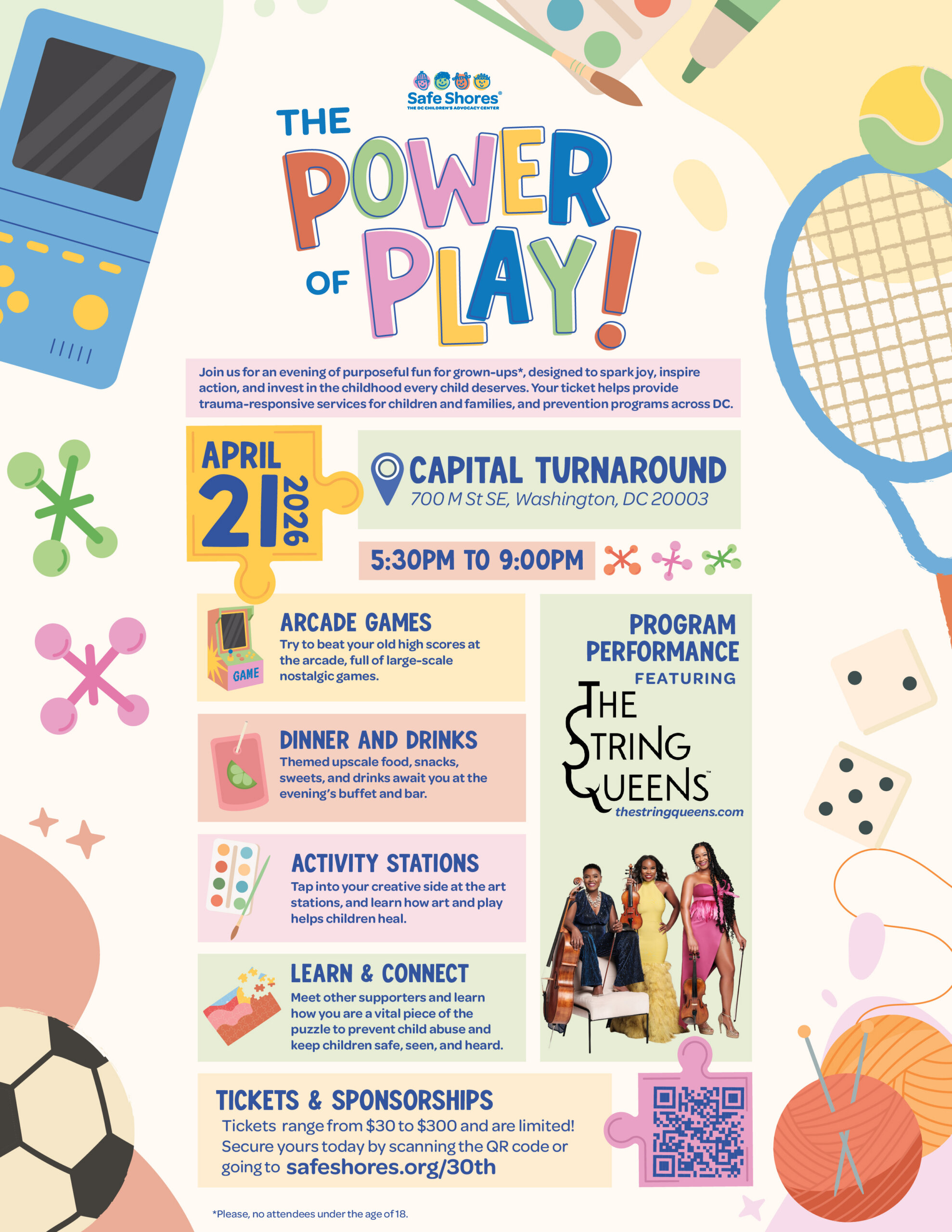 While The Power of Play! promises to be an evening of fun, joy, and whimsy, it isn’t just a fun night out. 100% of funds raised will go directly to Safe Shores’ work with children impacted by abuse. This means when you purchase a ticket, it goes directly toward providing services to children who have been impacted by abuse in DC. This helps ensure that Safe Shores can continue protecting DC’s most vulnerable people, children and families, for the next 30 years, and beyond.