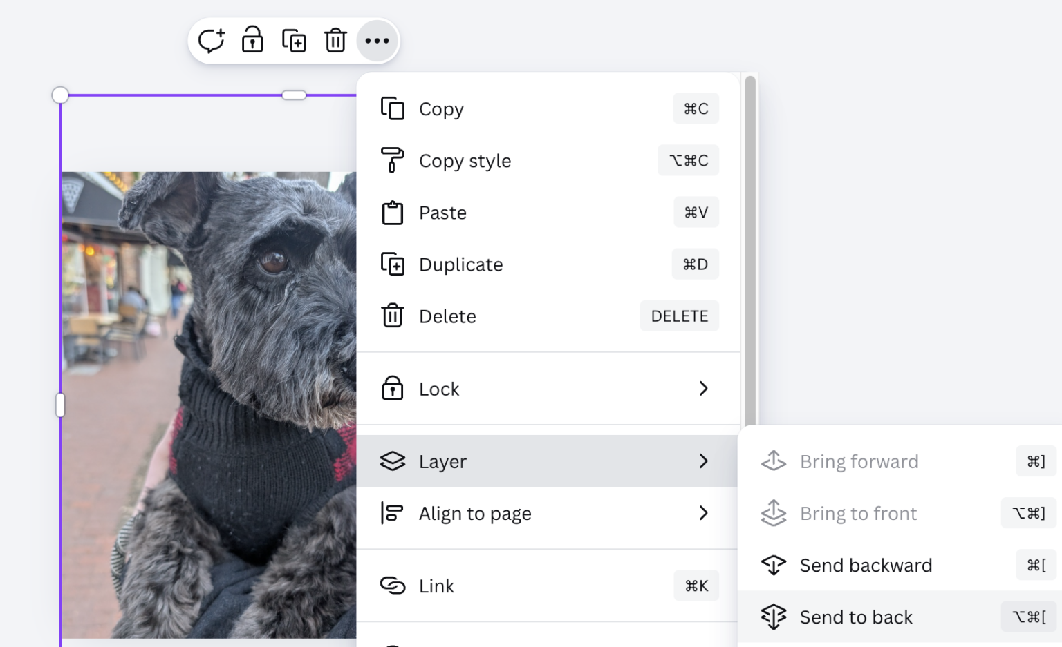 8. To move the image into the frame, select the three dots, then click “Layer” and click “Send to Back.”