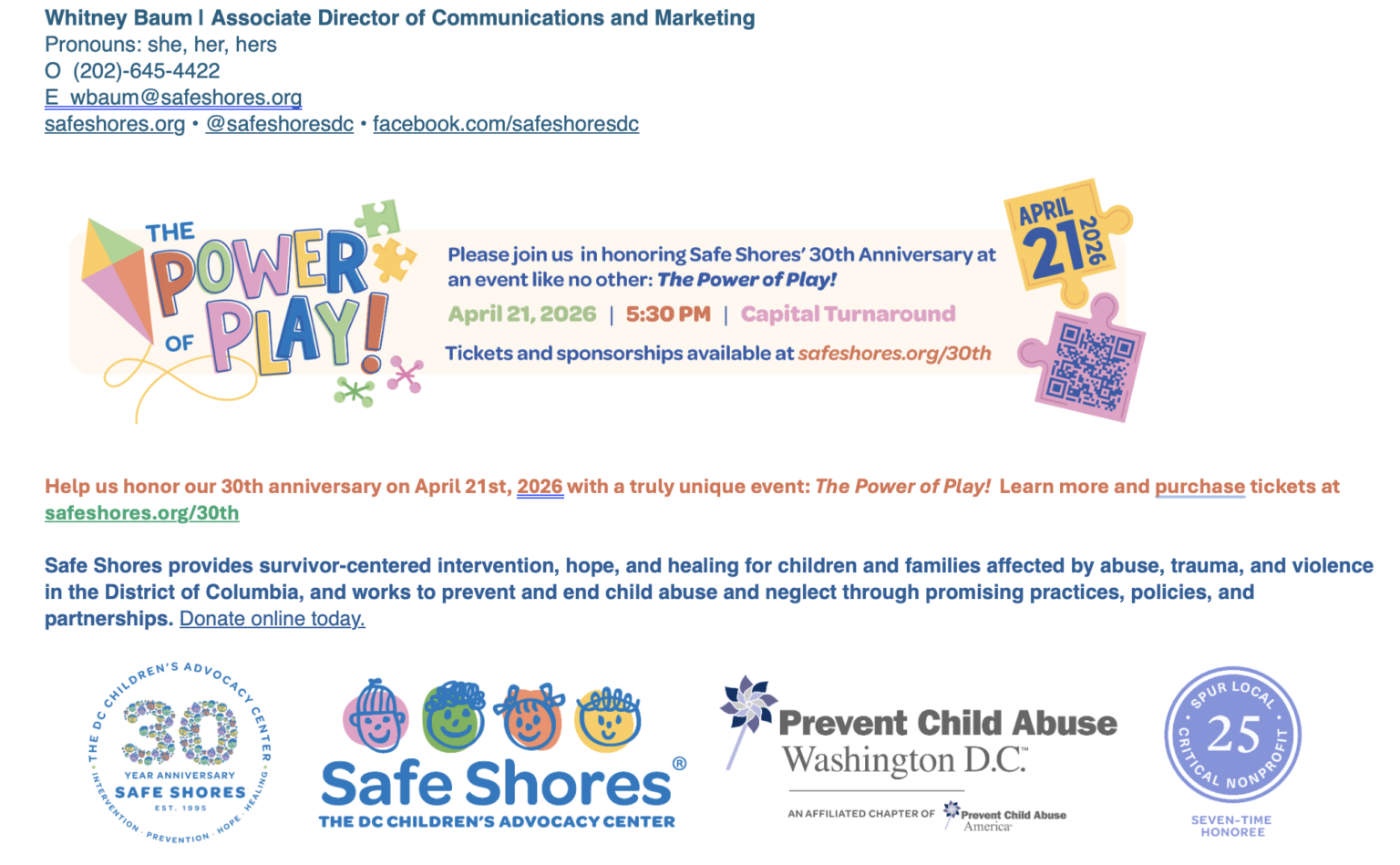 Hi [Name], as you know, I work for Safe Shores – The DC Children’s Advocacy Center. On April 21, we are having our 30th Anniversary Event called The Power of Play!
